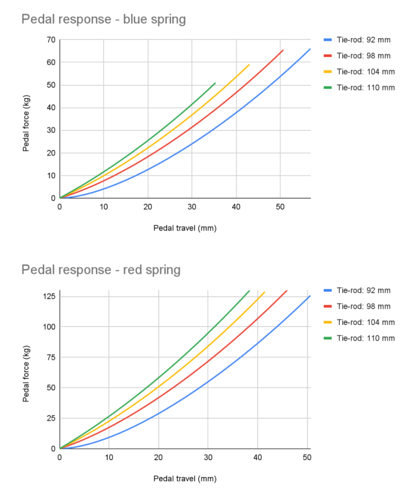 Here are graphs for the pedal responses when adjusted for various tie-rod lengths – with the spring spacer stack chosen accordingly to adjust preload to zero* for each setting:
