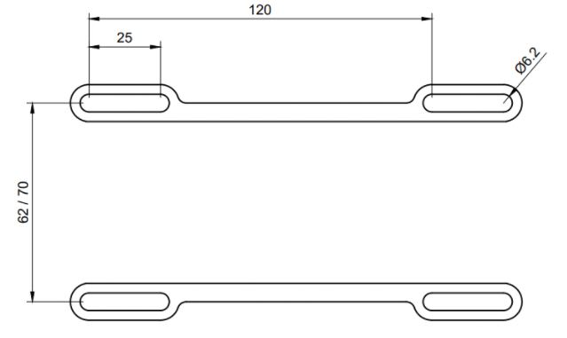 The following diagram represents the mounting dimensions for the pedal feet, with the brake having wider dimensions than the clutch and throttle: