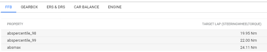 Option 2: Find the optimal in-sim max force for each car, then adjust the Wheel Tool max force for each car to your preference. Hit F to bring up the F bar in iRacing. We want to adjust the in-game Max Force so that the F bar only clips yellow or red over the heaviest curb hits and during wall impacts, but stays green (hanging around 40-70% force) during normal cornering. To more precisely calibrate the FFB Max Force for a car, you should be doing laps in the most grippy conditions possible: cool track temperatures, high track rubber, and non-worn tires. You should also pick a track that loads up the tires well with e.g. high speed essess, heavy braking zones and some jarring curbs. Combined with the grippy weather and track conditions, you’ll get an extreme case of FFB workload. If you have a Competitive VRS subscription, analyzing a lap of telemetry in the “advanced mode” on the FFB tab will tell you exactly the in-game setting you should select in Nm. The guidance is to configure the sim to only clip 2% of the samples from the high end of the force in the extreme grip lap test.