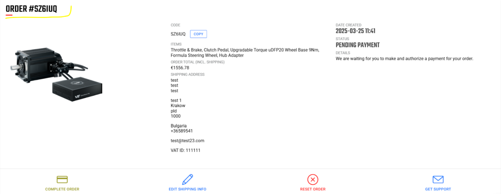 If you have any issues with the order itself or hardware, contact info@vrs.racing